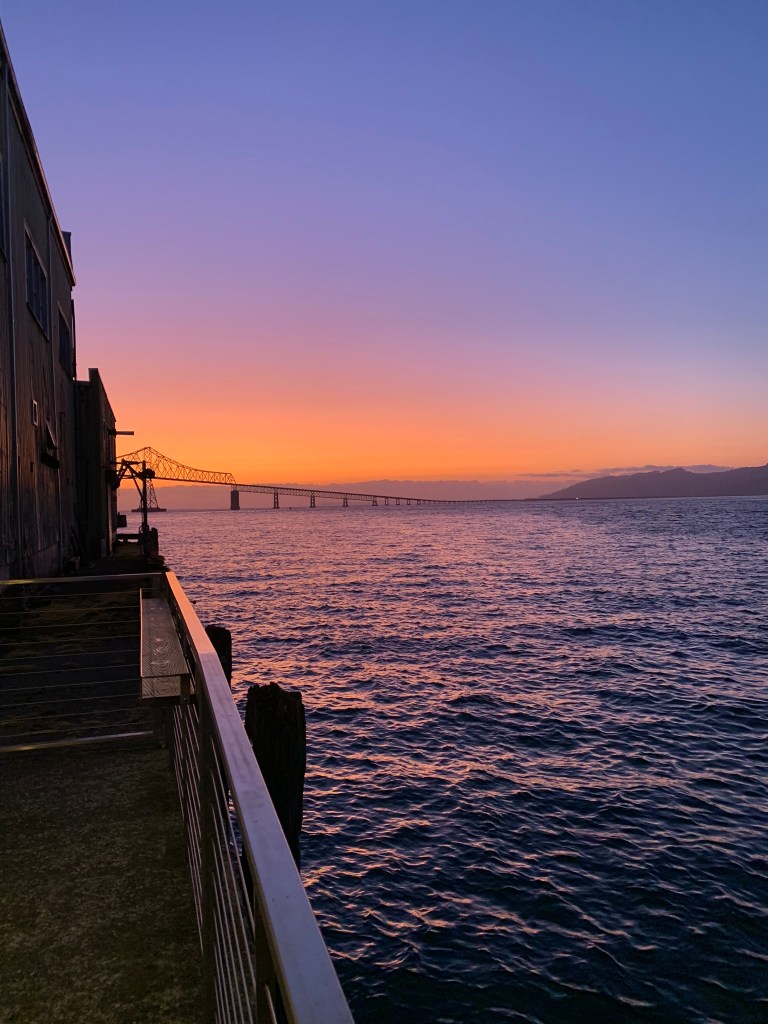 We checked prices for hotels in Astoria and decided to stay at the Astoria Riverwalk Inn. I was very hesitant to stay at this location because I am not a fan of staying in hotels with the doors on the outside. I am however, very happy we stayed here. Upon arrival we were welcomed with a firepit burning. I checked in and the front desk attendant was very welcoming and explained the features the Inn had to offer to include premade bags of smores kits to roast on the firepit out front. We received our key and headed to our room. The room was impeccable, one of the cleanest rooms I have stayed in. We laid out our wet tent for it to dry overnight and went to bed. The next morning we woke up early enough to catch the sunrise from our balcony. The views we were met with were incredible.