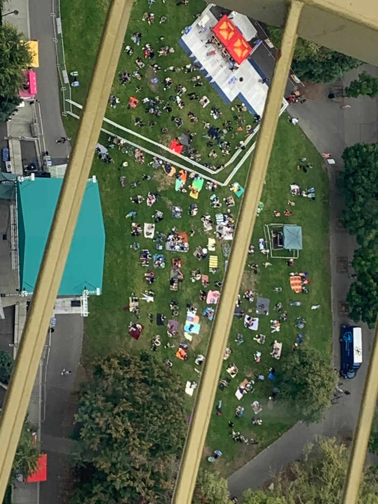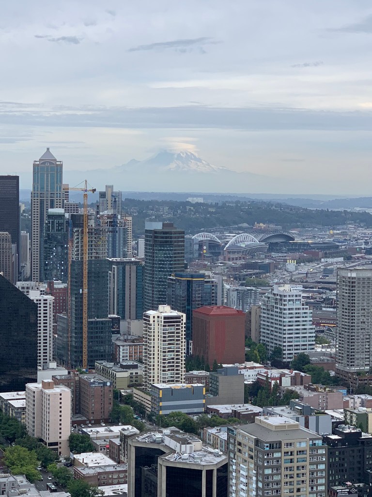Knowing we wanted to go back to the Space Needle, we decided to head there once we left the aquarium. We came across Lime Bicycles and decided this would be a fun way to travel to the Space Needle. Once at the space needle we took more pictures of Mount Rainer and the area below. We saw a concert going on in an open field.