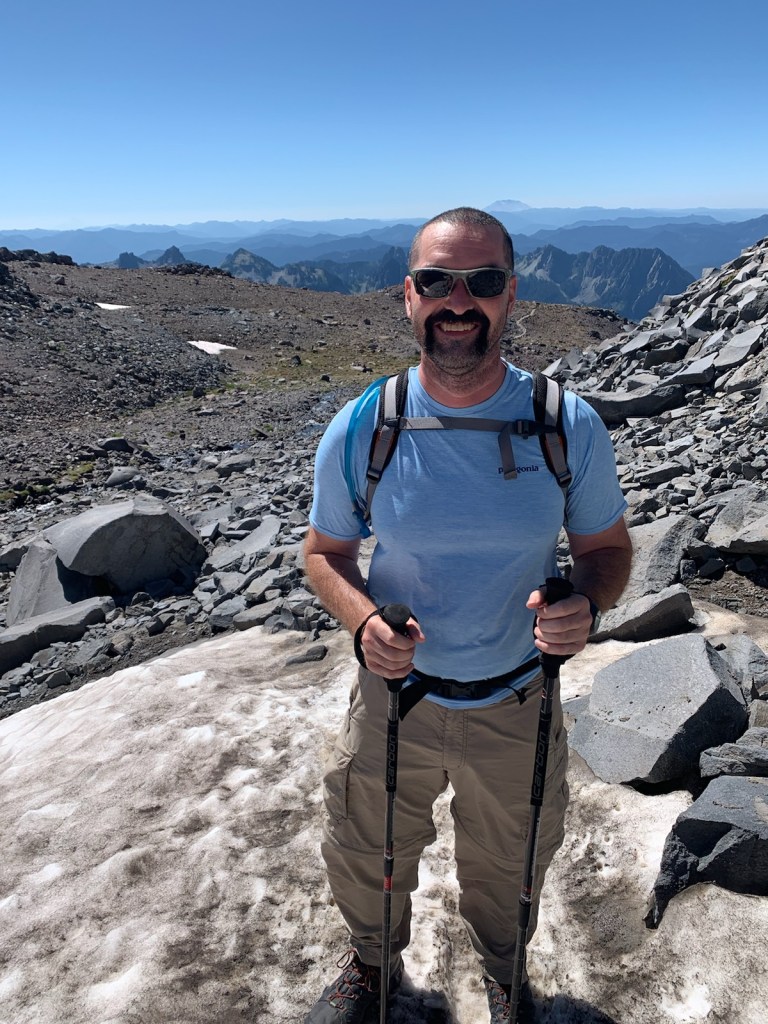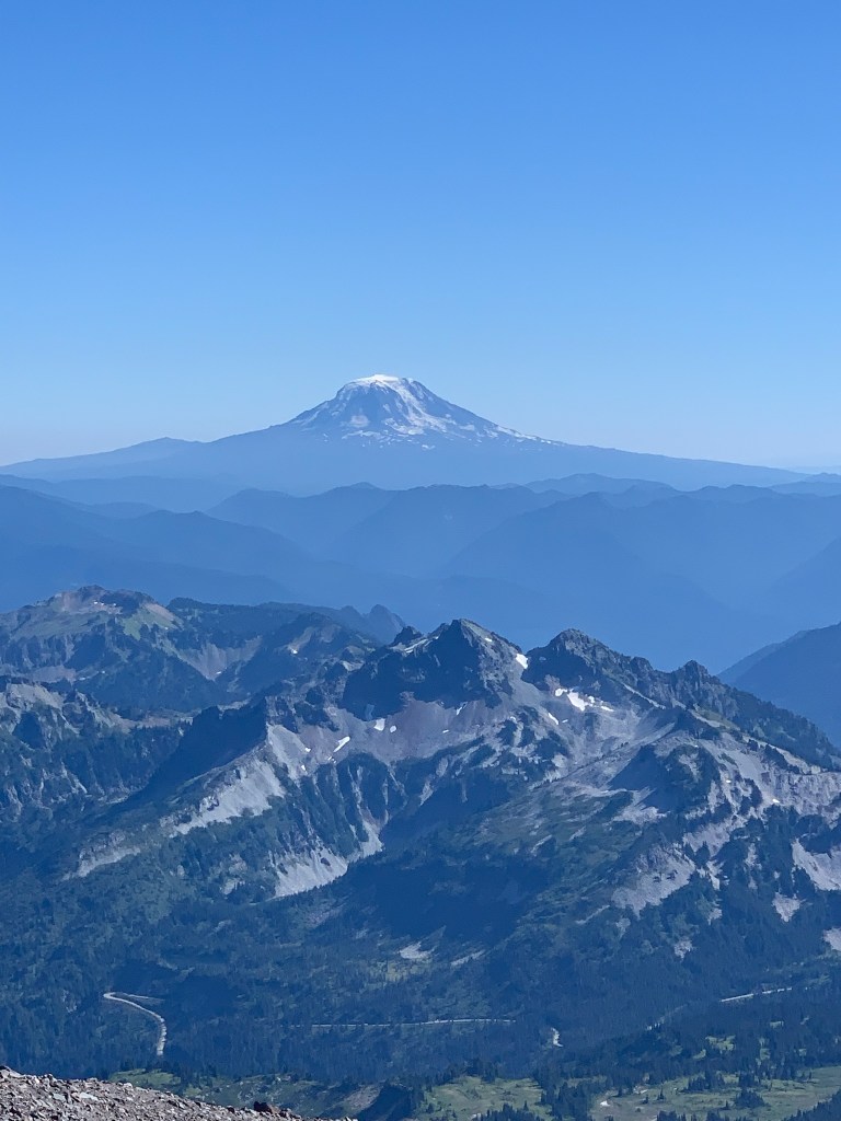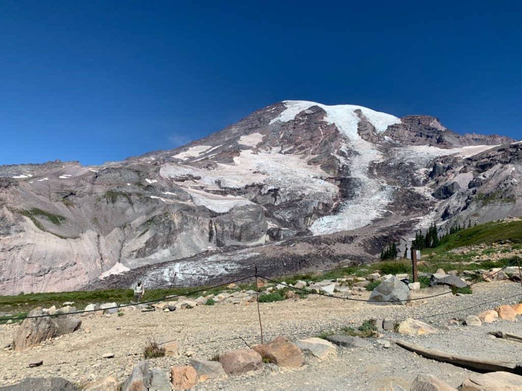 We continued our ascent, pausing to take in the views of neighboring mountains. We got to about 9500 feet of elevation about about a 1/2 mile from Camp Muir and I couldn’t go on anymore. I would hike a few feet and have to keep stopping. The terrain became very sketchy at this point and we did not have crampons. Blake kept reassuring me that it is okay that we didn’t make it to Camp Muir. I was very disappointed in myself but it was better to be safe than sorry. I then had an overwhelming fear of the descent. We took our time and headed down the mountain. I received a FaceTime call from my kids and I got to show them around the snowfield and the area. The kids stayed with my parents while we were our on trip. We were very thankful for that! Continuing our descent, we glissaded a few times, this was my first time glissading down a mountain.