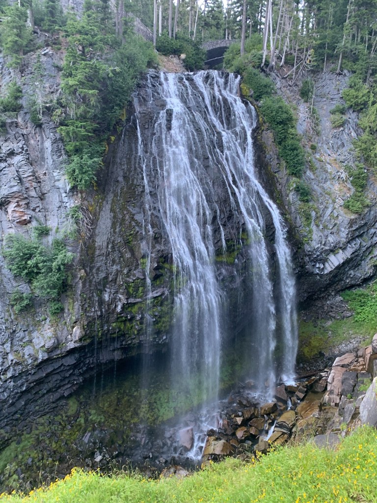 Once leaving Paradise parking area we headed out of Mount Rainier National Park. Before leaving the park we saw a sign for Narada Falls and decided to stop. We parked in the parking area off Longmire to Paradise Rd. The entire out and back trail is approximately 0.3 miles. It is a steep hike down to the falls, however totally worth it. There is a viewpoint from the top but to really take in all the falls have to offer, you really need to hike down. (Note: we did the hike in flip flops)