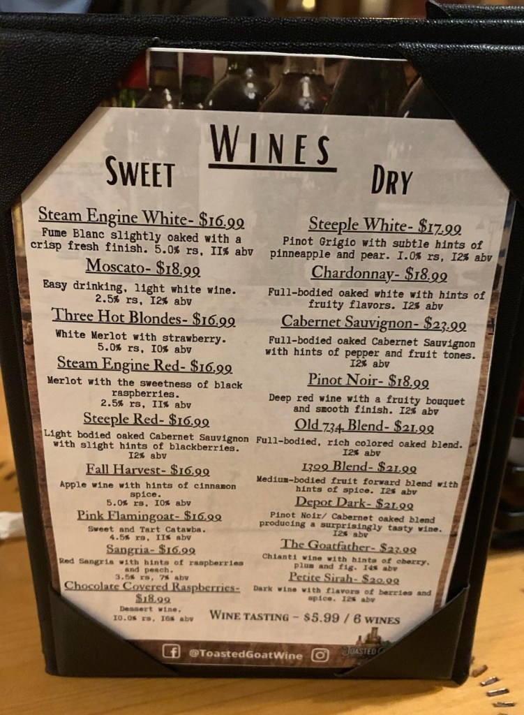 Goats being my favorite animal, Toasted Goat Winery https://toastedgoatwinery.com seemed like an appropriate next stop. Toasted Goat is located in Frostburg, MD in the Gunter Hotel. The tasting room for the winery is located in the Hotel’s Speakeasy (this is actually the site of an old Speakeasy). Blake and I did a tasting consisting of 1 white and 5 reds. We purchased the bottle of white but all 6 we tried were fantastic.