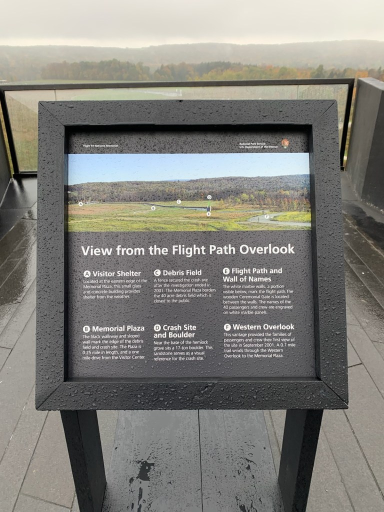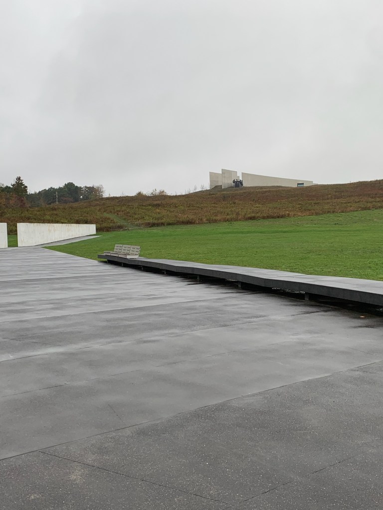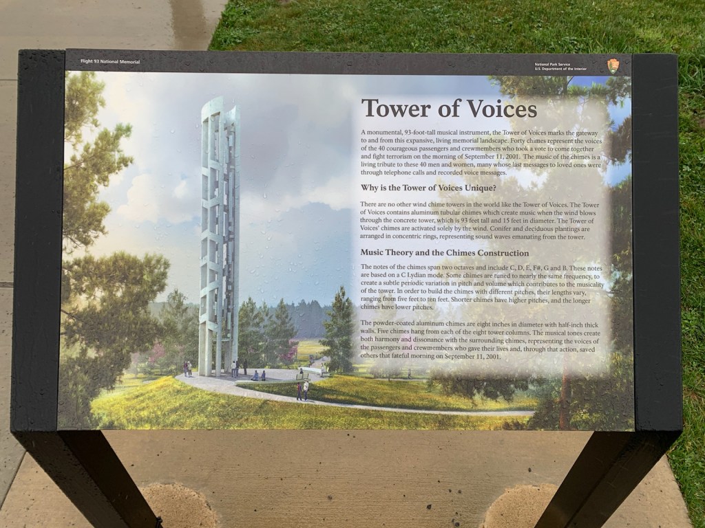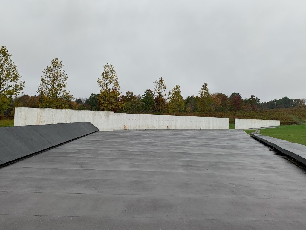 Once we left Frostburg, MD, we headed for Shanksville, PA – the site of the Flight 93 Memorial. We arrived at the National Memorial Park and immediately we were both filled with emotion. The weather also made for an even more emotional experience. The memorial park features, the main visitors center which contains artifacts and information from flight 93. Photography is not allowed in the visitors center. Just past the visitors center is the memorial site that contains the wall of names of all of the crew and passengers that lost their lives on 9/11/2001 as well as a bolder in the field to mark the location of where the plane went down. At the exit of the memorial park is the Tower of Voices, a 93 foot (flight number) musical instrument consisting of 40 chimes (number of passengers and crew members).