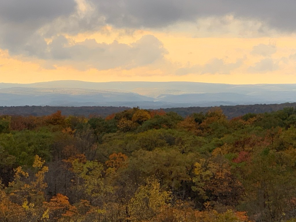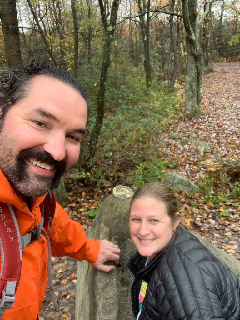 Along with signs and a benchmark at the summit, there is also an observation tower. The tower is above the trees and allows for 360 views of the mountains. We were really hoping for more sun to highlight the fall colors but due to the rain we didn’t get lucky. We did get to take in some of the sunset from the top of the tower. We didn’t stay at the top of the tower long because it was very windy and chilly. Plus it is small and other people were coming and going. (Yes we were the only people on the trail, however if you want to quickly check off a high point, there is a parking lot that is right at the tower, this access is also ADA friendly).