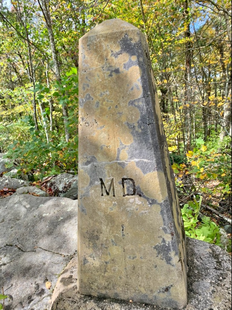 One of the trail marker signs had an arrow pointing towards a small side trail with the MD/WV border. We wanted to check it out. Sure enough in the middle of the woods is a Bolder indicating the MD/WV border.