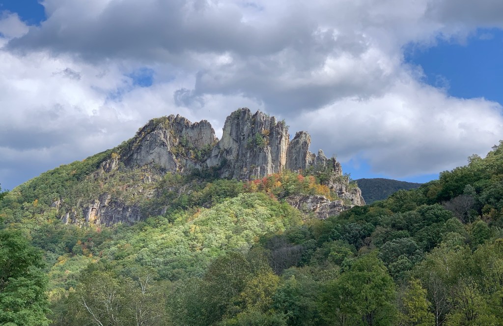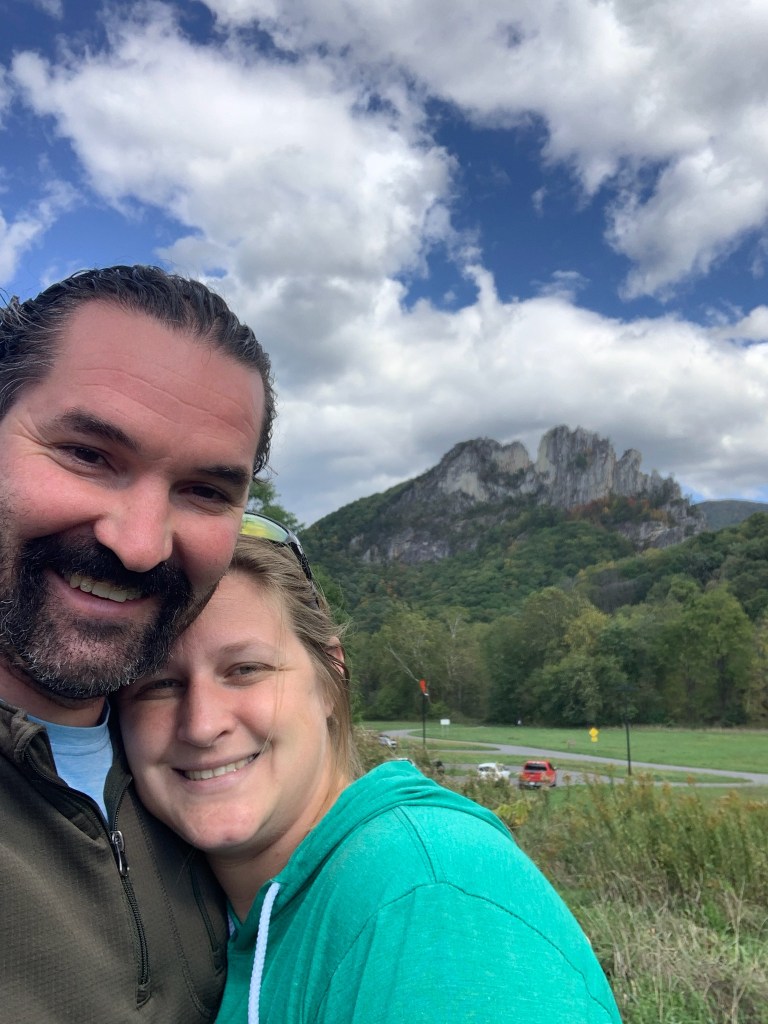 Being so close to Seneca Rocks, WV, we had enough time to take a picture. Seneca Rocks is special to me because it is the first place Blake and I ever went together for a weekend vacation. Blake has been going for years and years and I was overjoyed when we went because he wanted to share it with me. Last year we took our daughter there for her first time when she was 6 months old. We didn’t have enough time to hike the mount today, we were however able to get a fantastic picture of the sun lighting up the rocks. (I was also able to get my cancellation stamp in the visitors center).