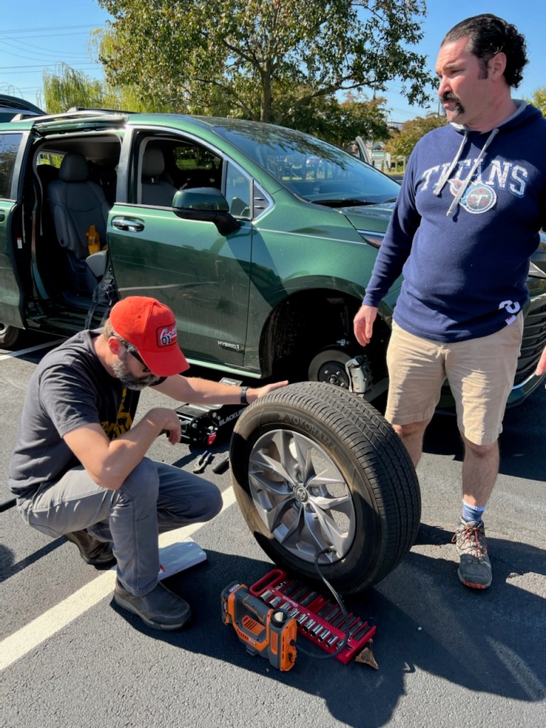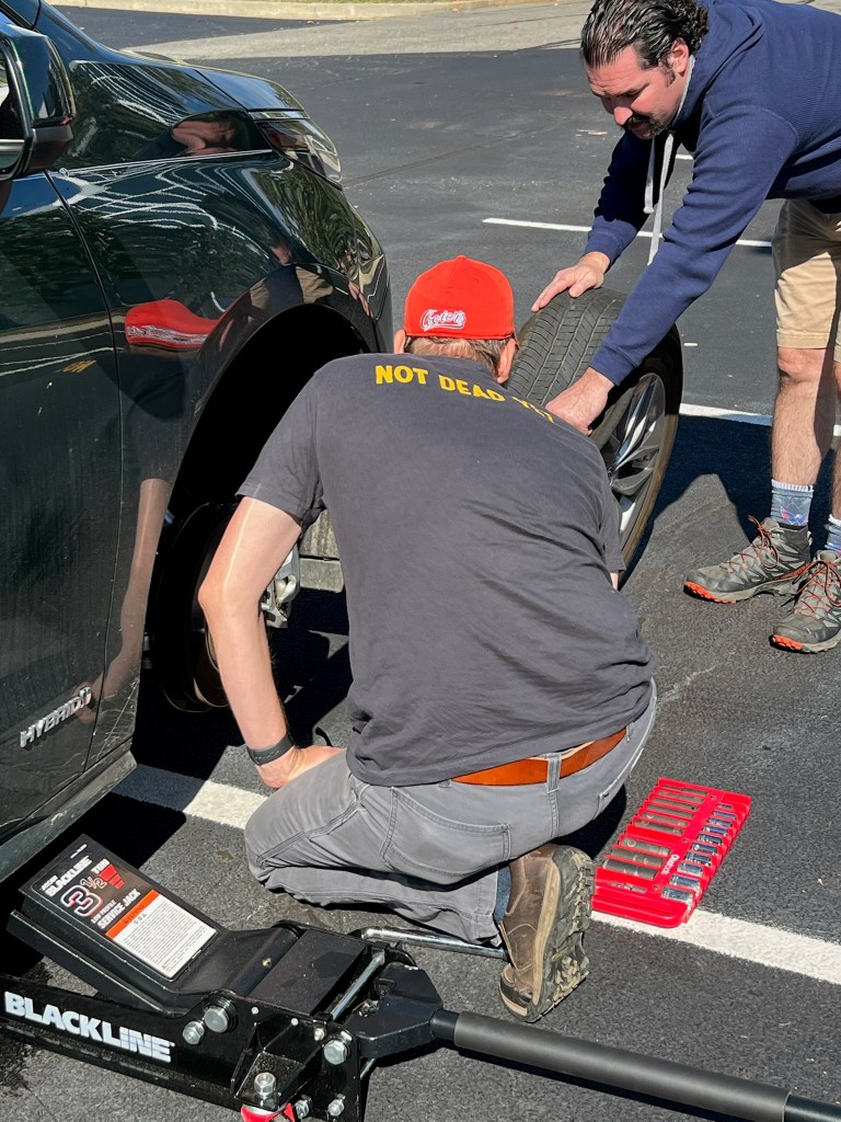 Ty arrived with his jack and tools and him and Blake went to work to fix the tire. I researched places nearby that were open on Sundays to get the tire looked at an possibly a new tire.