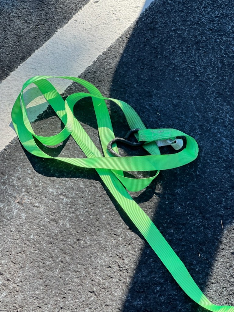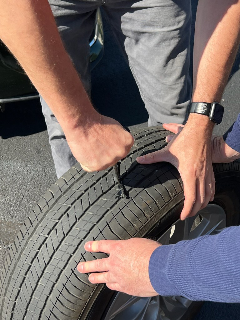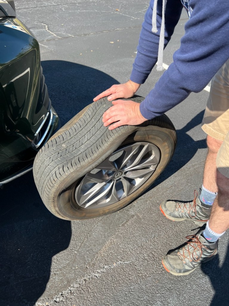 We were on I295 about to get off onto I95 when Blake hit a ratchet strap. He didn’t think anything of it at first and then all of a sudden my car started having warning messages come up and switched to the tire pressure screen. The tire pressure in the tire that hit the ratchet strap went from 38 to 28 to 12 to 0 in less than 1 minute. We were able to get off the interstate safely and pull into an empty parking lot.