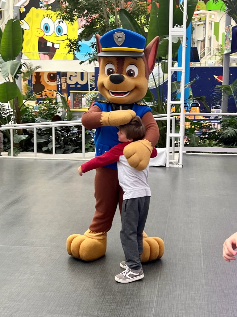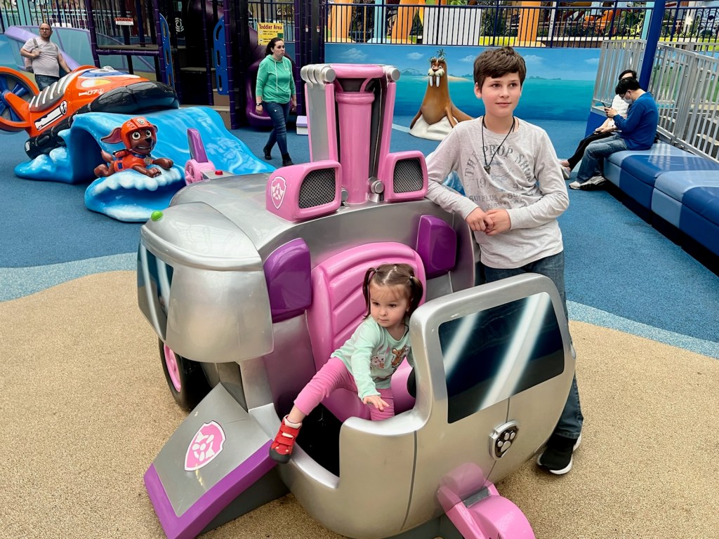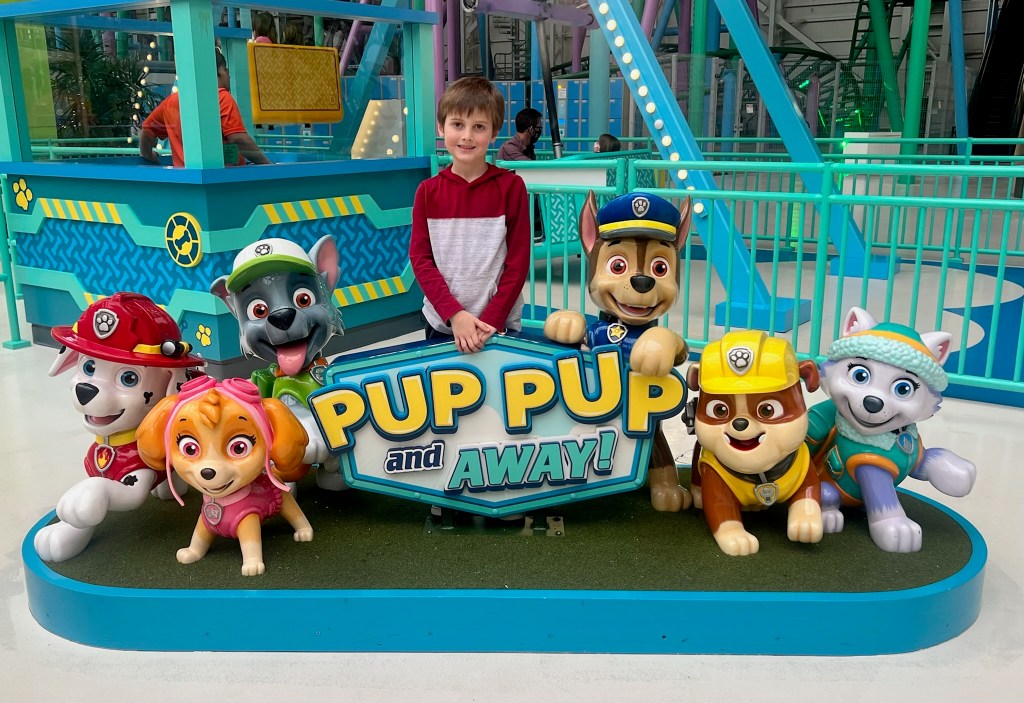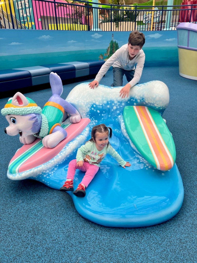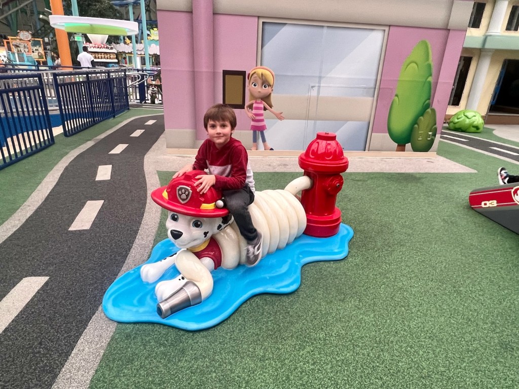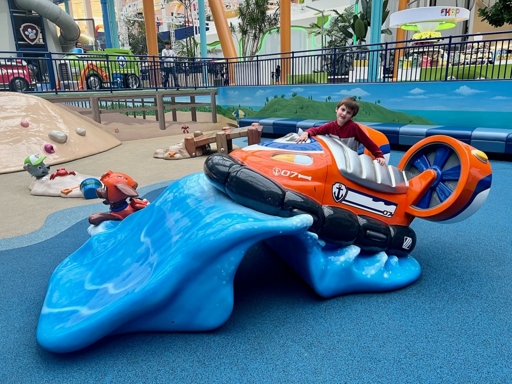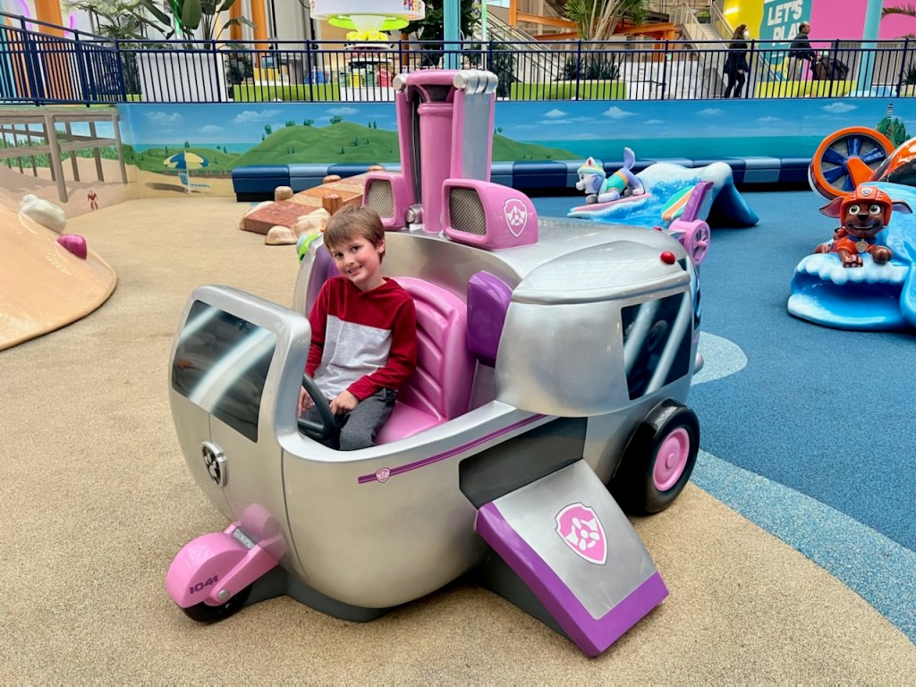 PAW Patrol Adventure Bay play area that is. The kids had so much fun playing on all of the cars, lookout tower and slides. The play area is huge. Austin took pictures with everything. He was so happy to play in Adventure Bay.