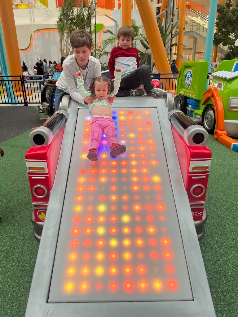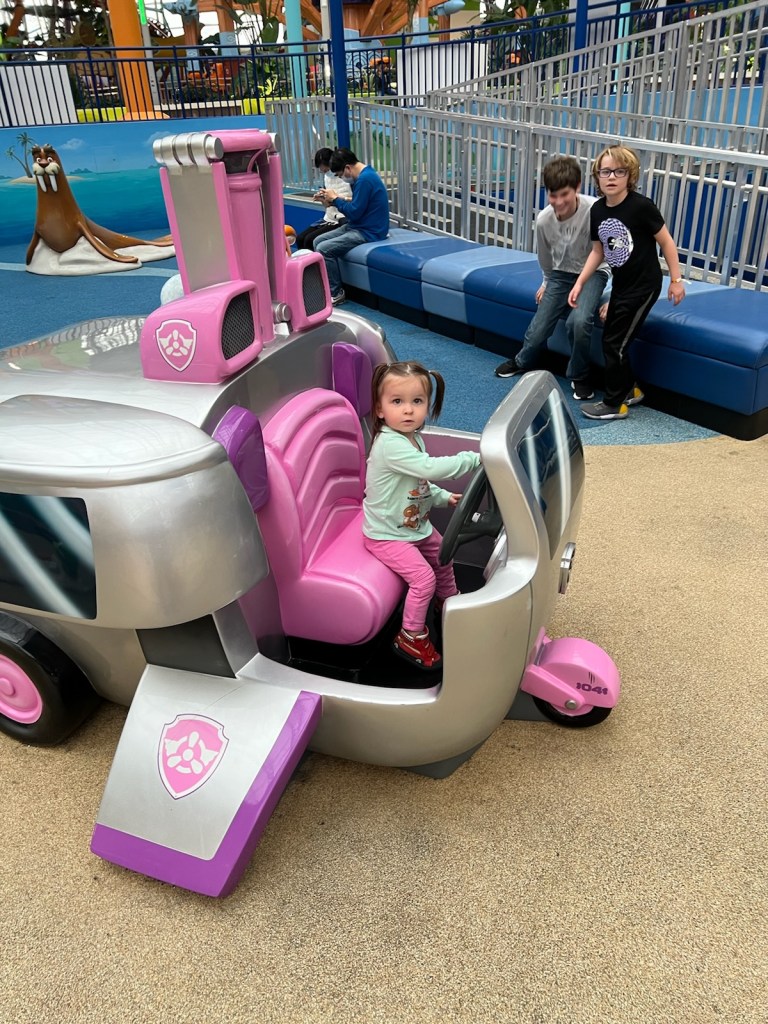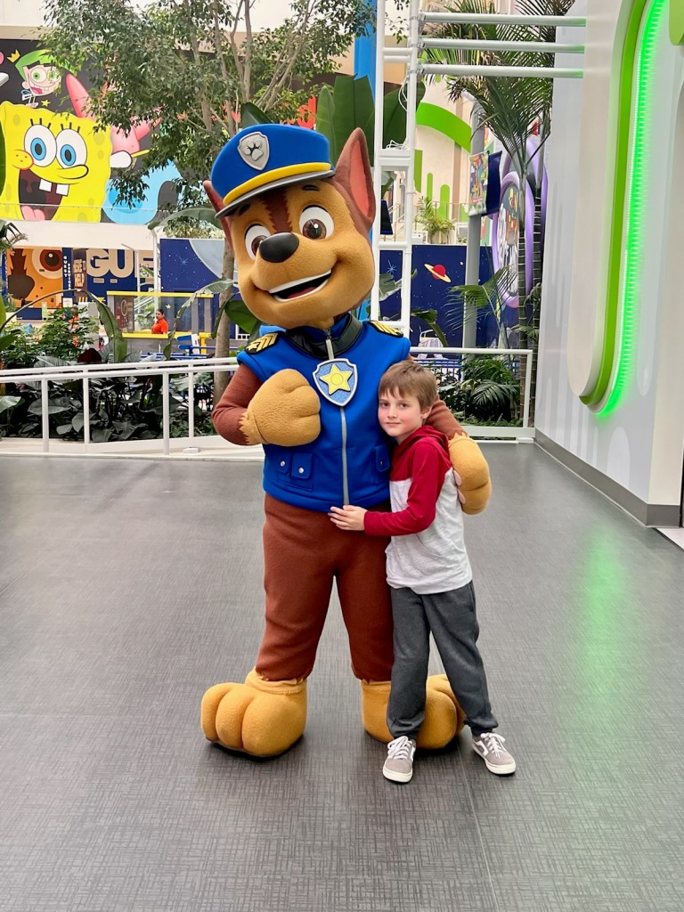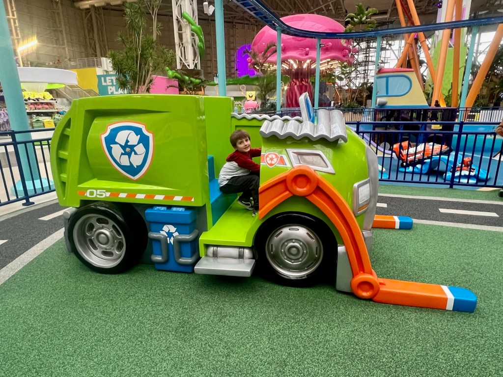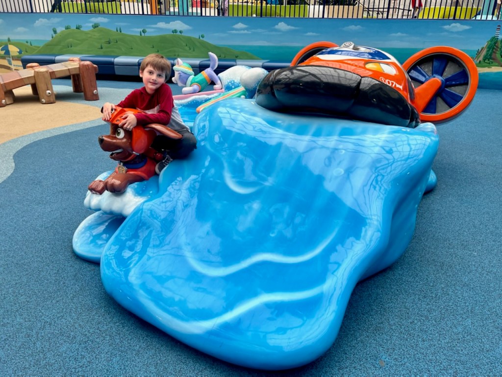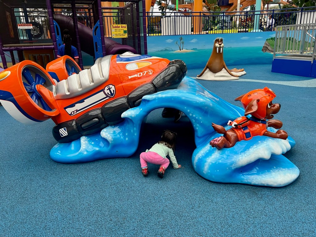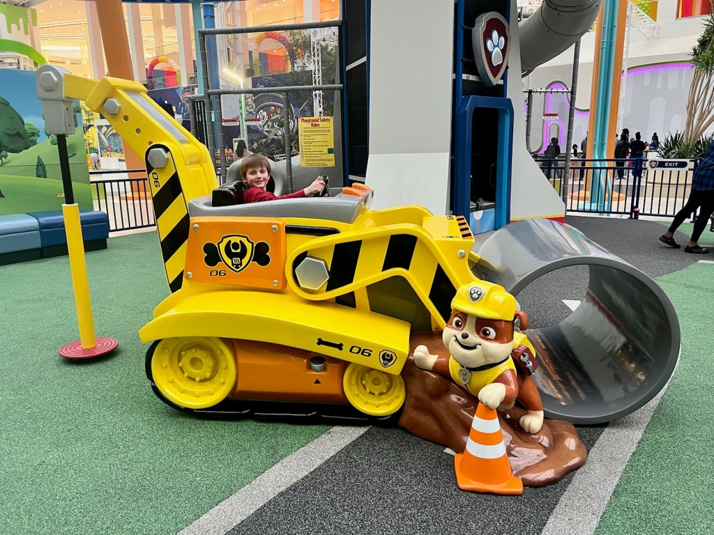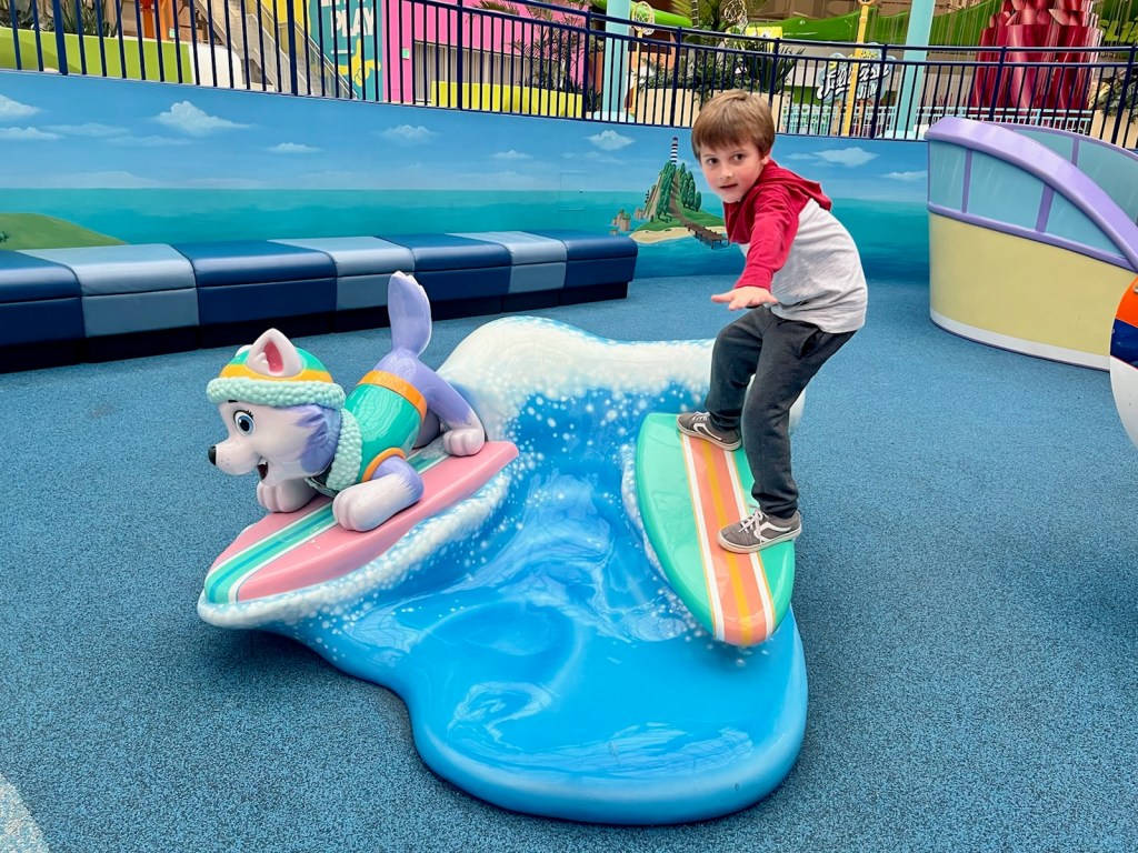 PAW Patrol Adventure Bay play area that is. The kids had so much fun playing on all of the cars, lookout tower and slides. The play area is huge. Austin took pictures with everything. He was so happy to play in Adventure Bay.