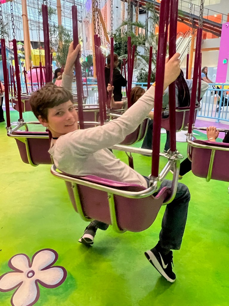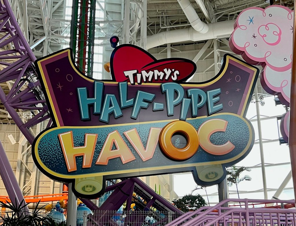We all got on Timmy’s Half Pipe Havoc. A giant skateboard ride goes back and forth, while spinning on a half pipe.