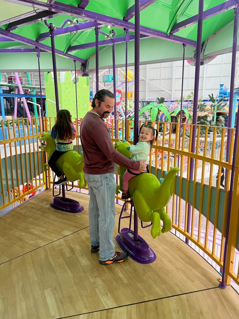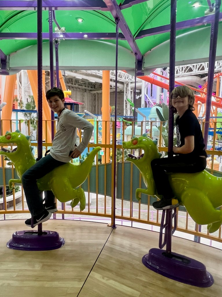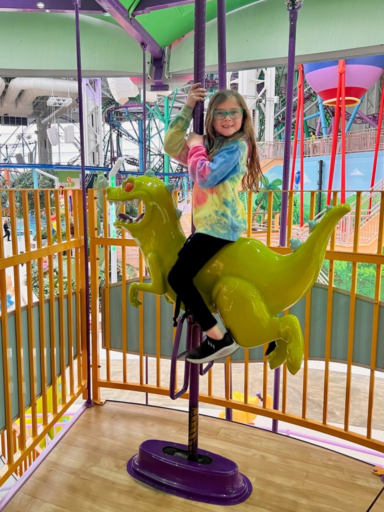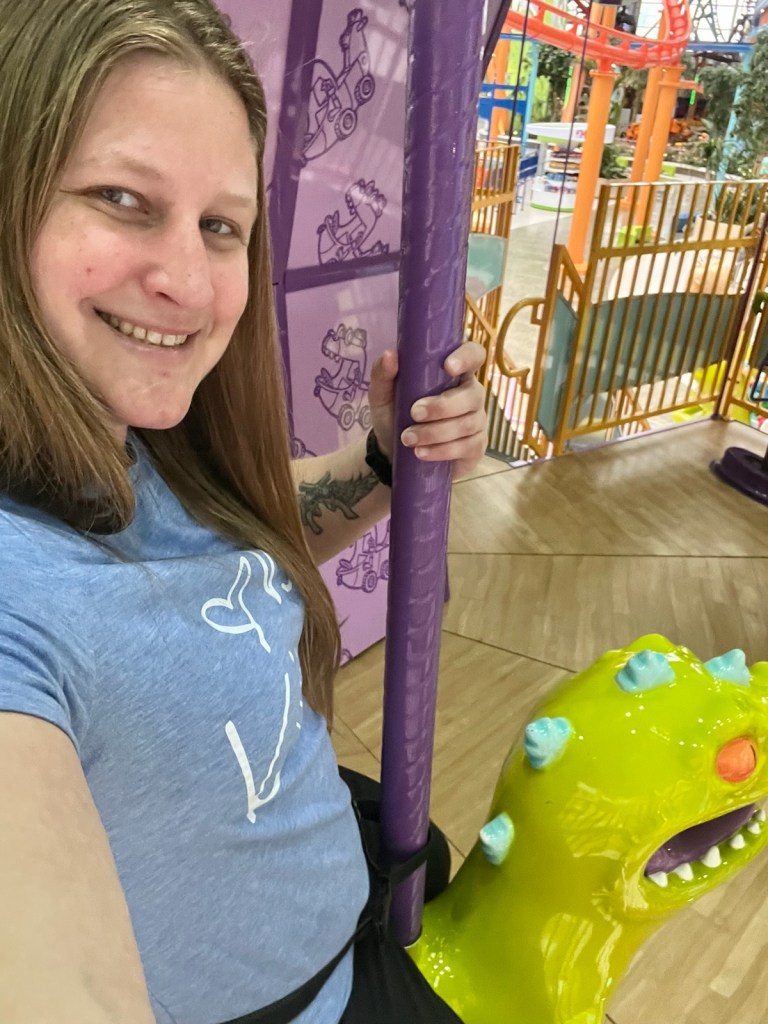 The very first ride we went on was Rugrats Reptar Go-Round. A 2 story carousel type ride with Reptars as the traditional horses. Such a fun first ride.