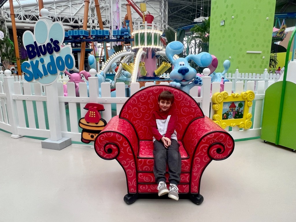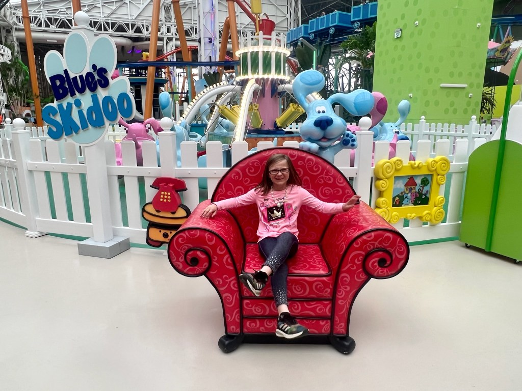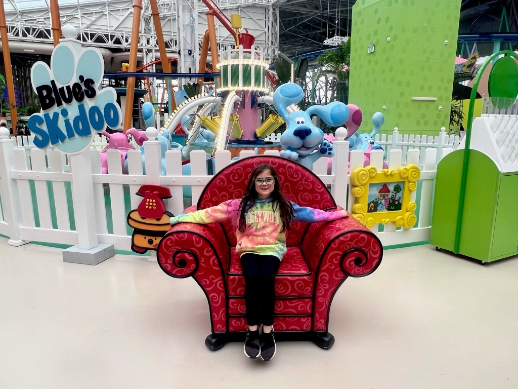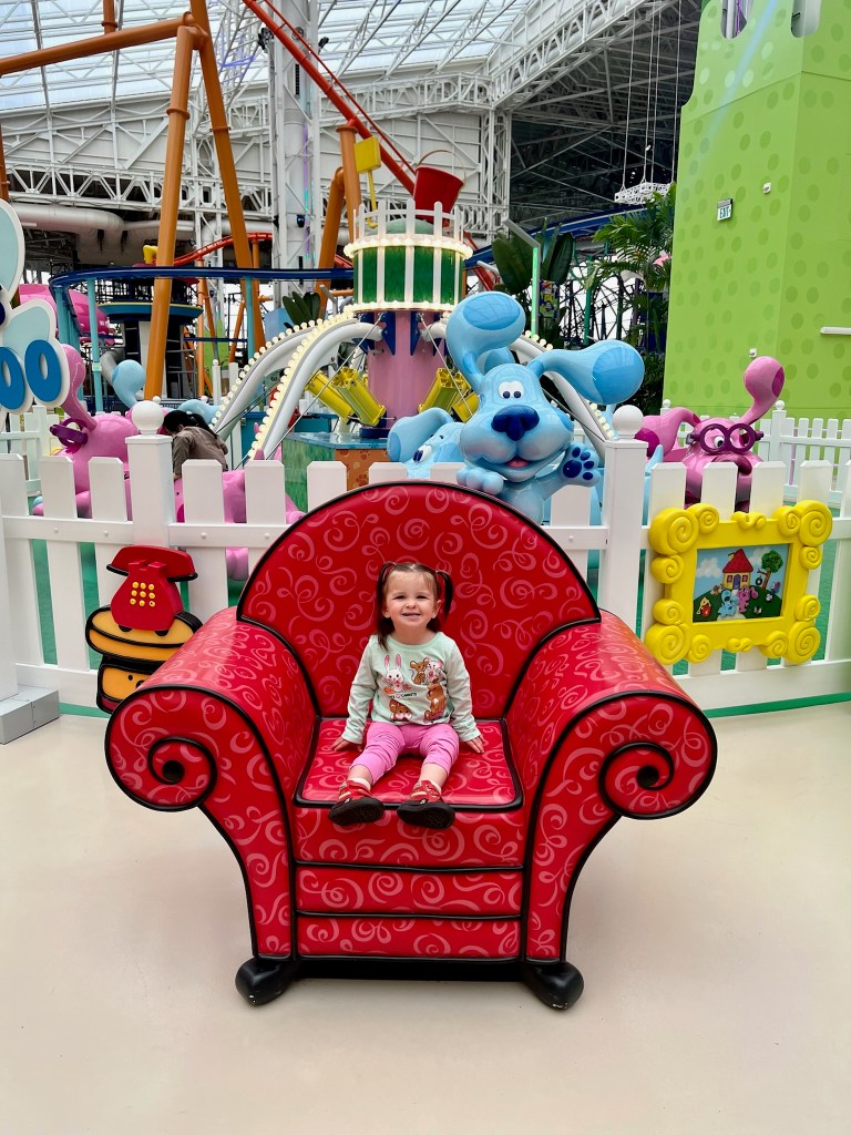 Taylor’s best friend loves Blue’s Clues and we found the big red chair in front of the Blue’s Skidoo ride and we had to take her picture to show her friend.