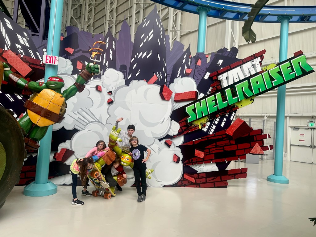 Next we went to the back of the park near the Shellraiser. Unfortunately for us, the Shellraiser was closed for maintenance. Very disappointed about this because it is one of their best rides but it was okay, so many other rides to ride. The kids still wanted to have their picture taken in front of it.