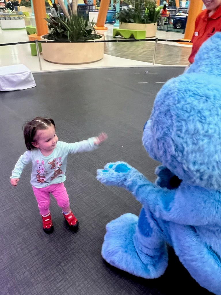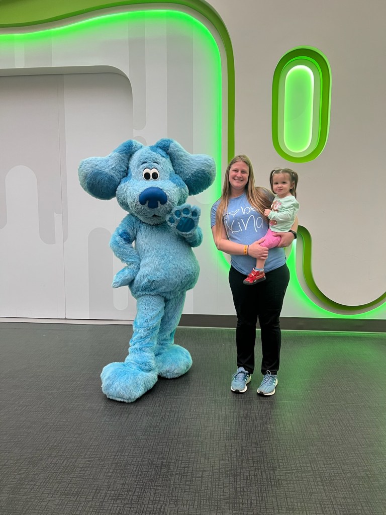 While everyone else went on the swings, I saw Blue was on stage for the meet and greet and I took Taylor over to get her picture with him. She really enjoyed meeting him.