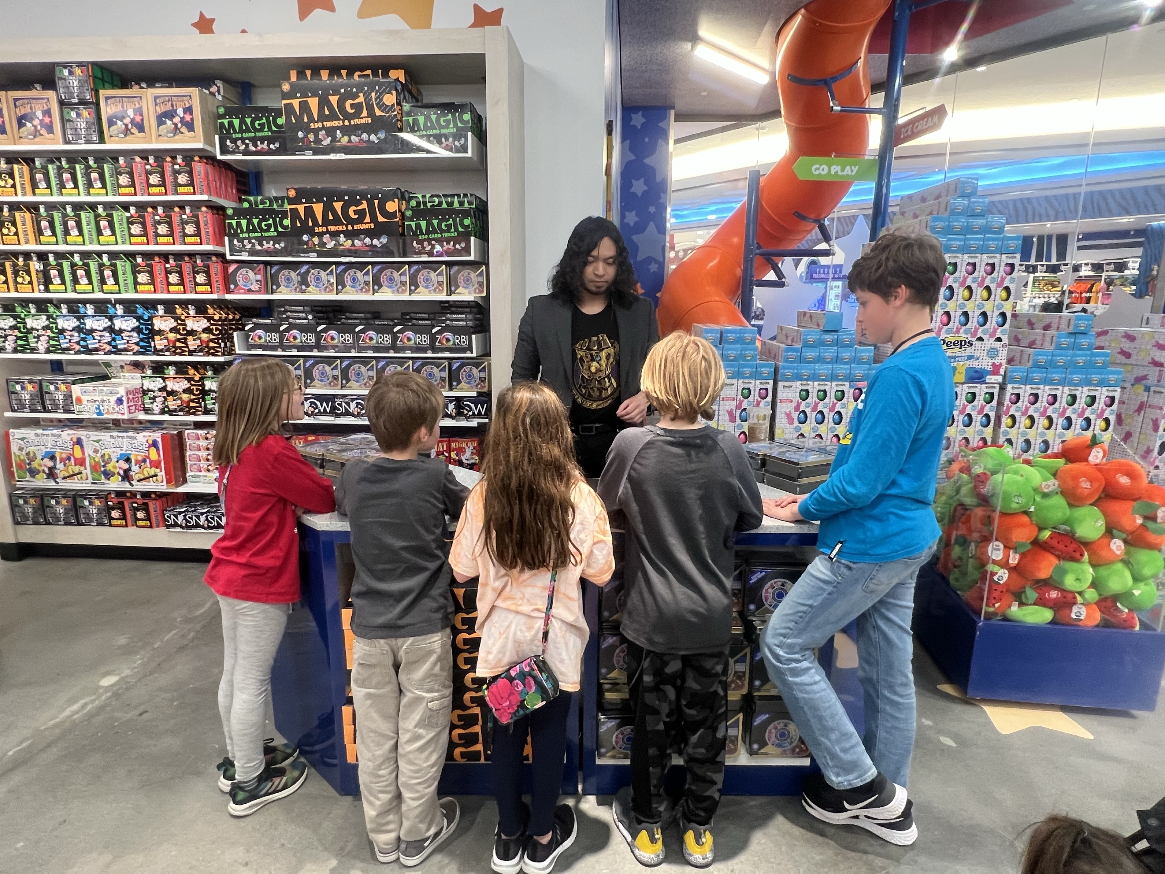 Most of the kids have never seen an actual toy store since the majority of Toys R Us stores closed years before. Needless to say they were a bit overwhelmed. We actually left without buying anything. As soon as we walked in there was a magician at the counter and he immediately started showing the kids magic tricks.