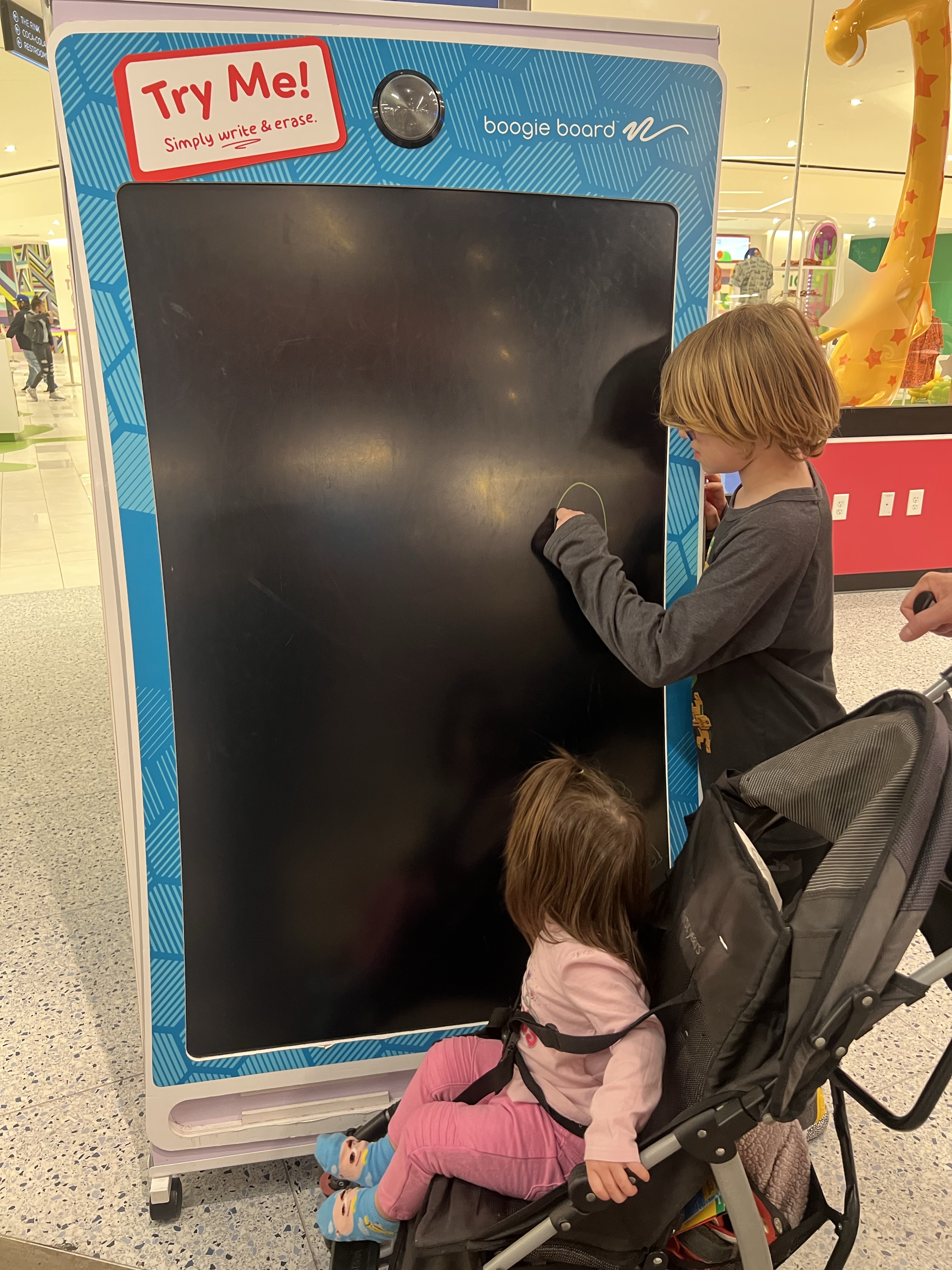 Taylor is absolutely obsessed with Boogie Boards. She has 4 of them. Well Toys R Us did not disappoint her when she saw their Boogie Board that is bigger than her.