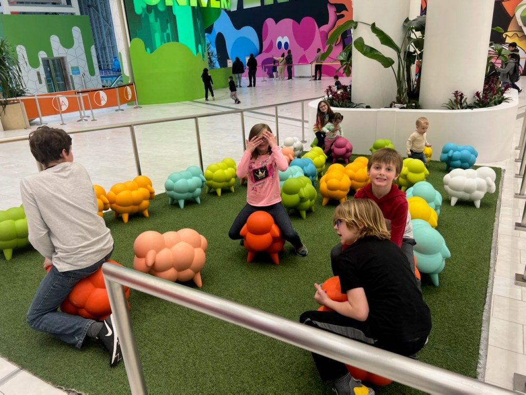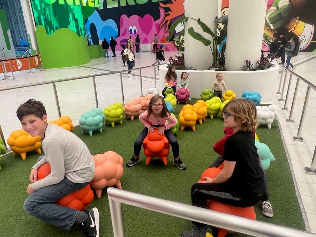 Outside of Nickelodeon Universe are these little play areas with sheep. The kids enjoyed playing on them while waiting for the park to open.