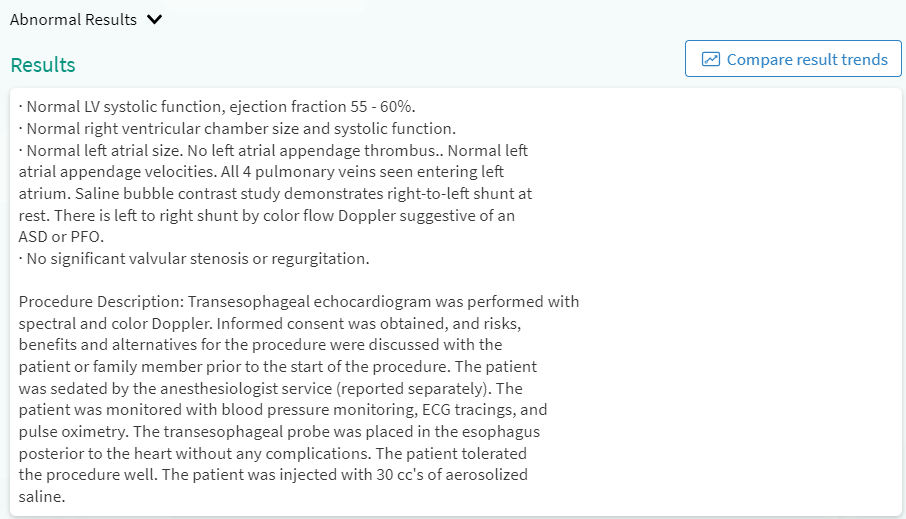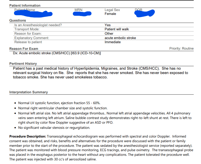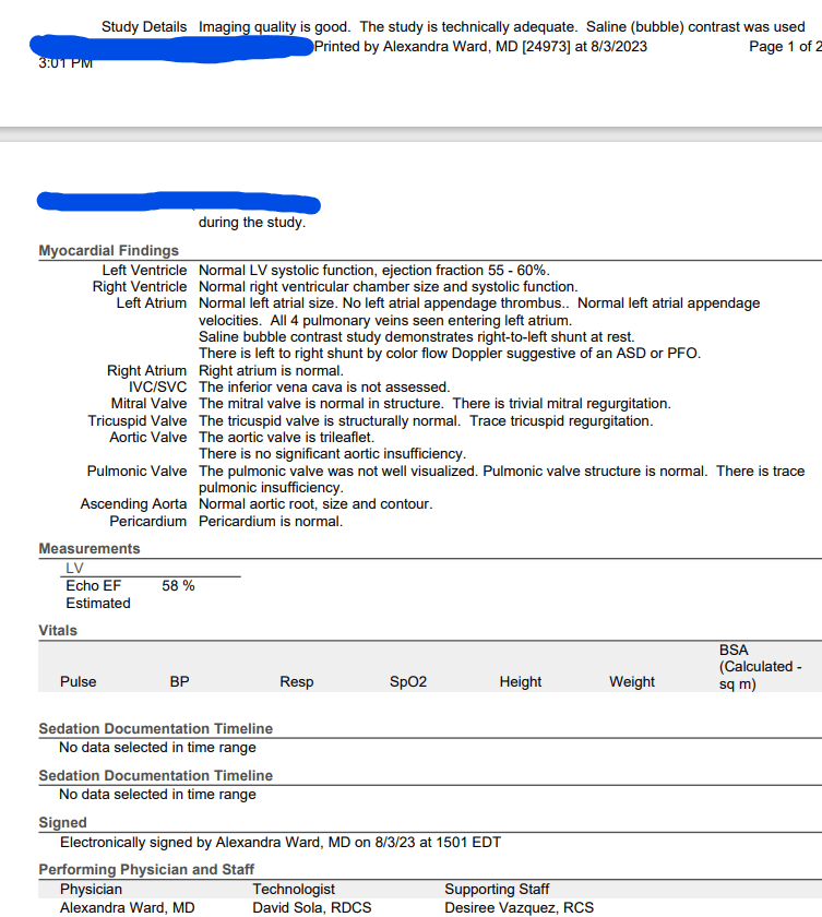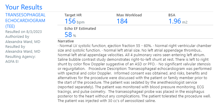 Once I woke up, Dr. Ward came in to check on me and to explain her findings. She first told me that I woke up twice during the procedure and tried to fight. I thought this was funny, especially since I did not remember any of it. She then proceeded to tell me that all looked normal on the test with the exception of the Left to Right Shunt by Color Flow Doppler suggestive of an ASD or PFO.