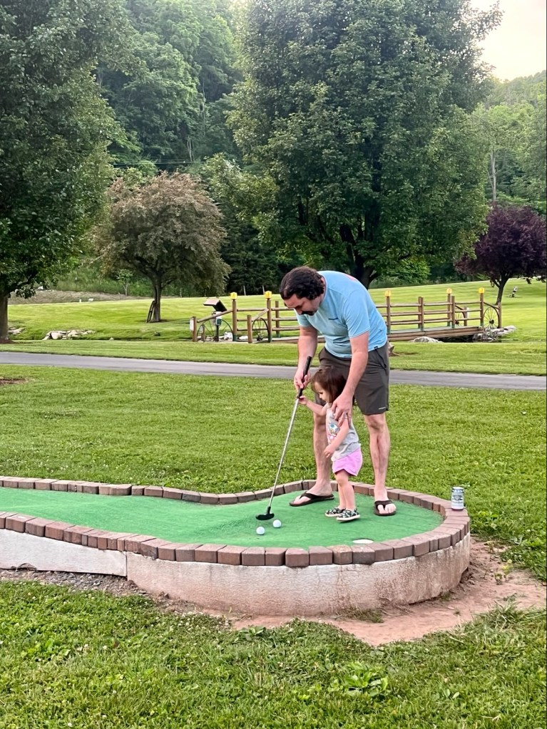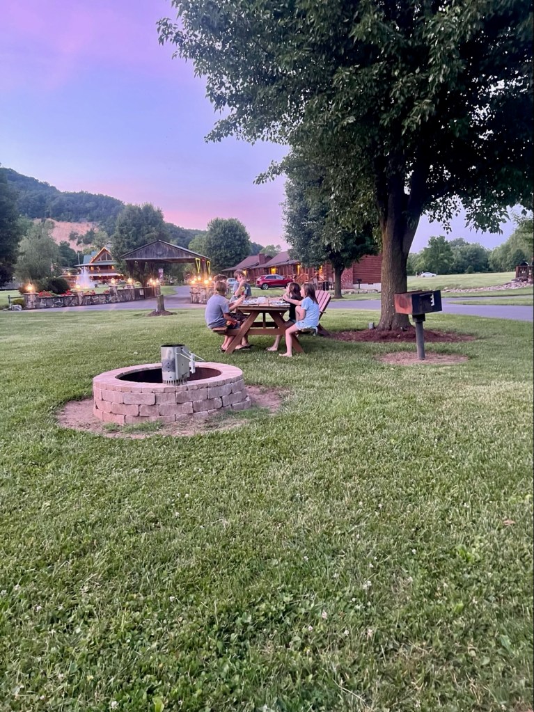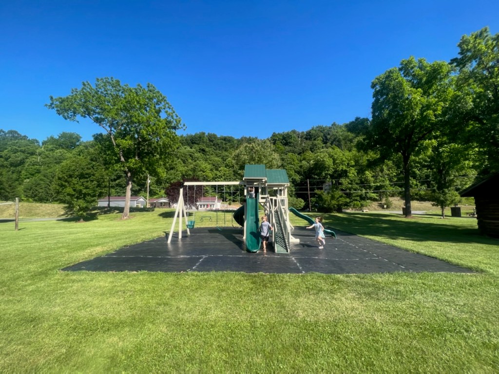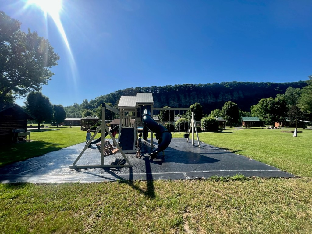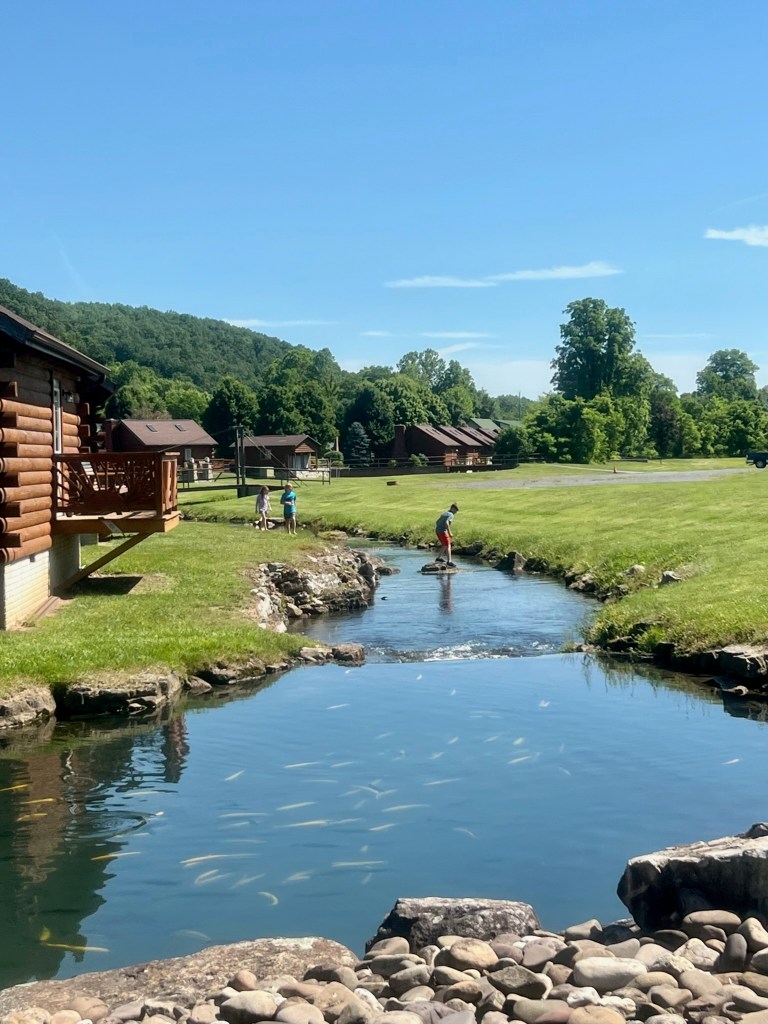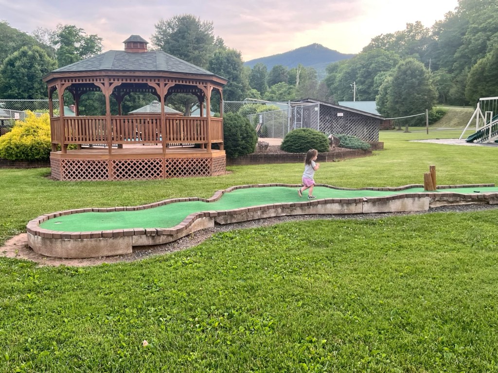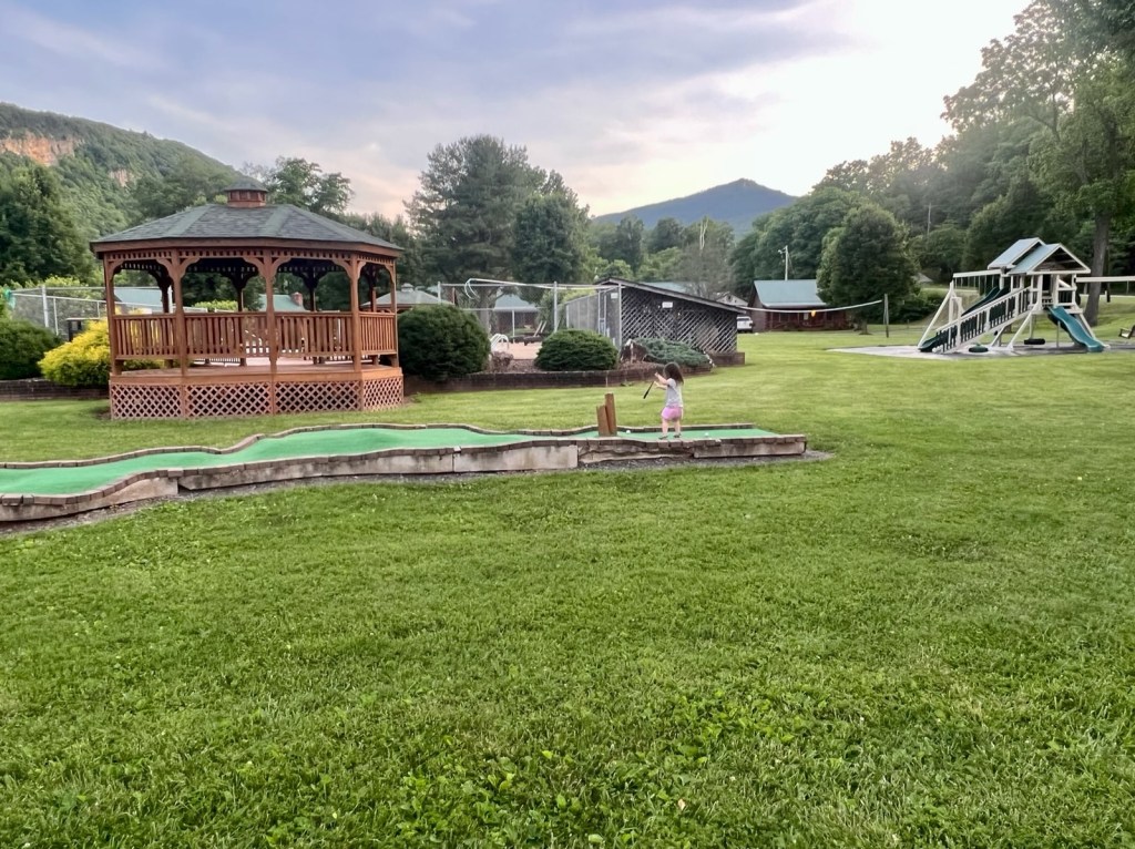 Right outside of our cabin was the entrance to the pool as well as a playground, fishing pond and 1 hole of mini golf. While I cooked breakfast the next morning the kids played on the mini golf hole and on the playground.