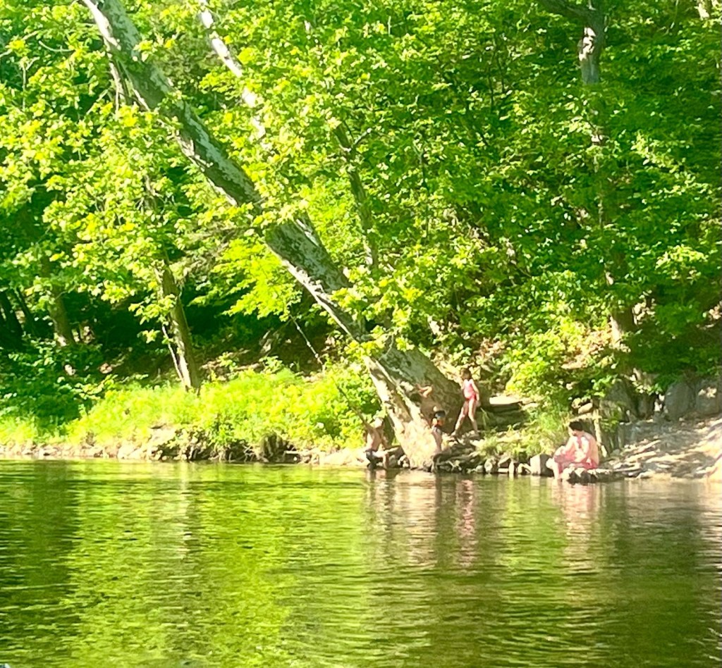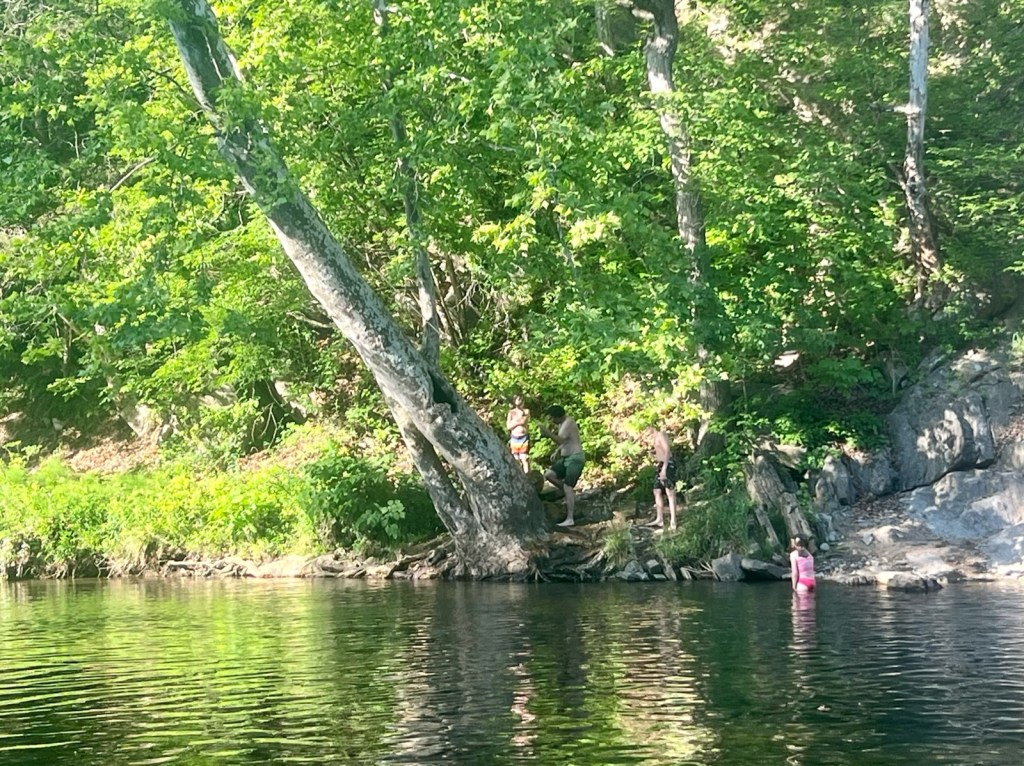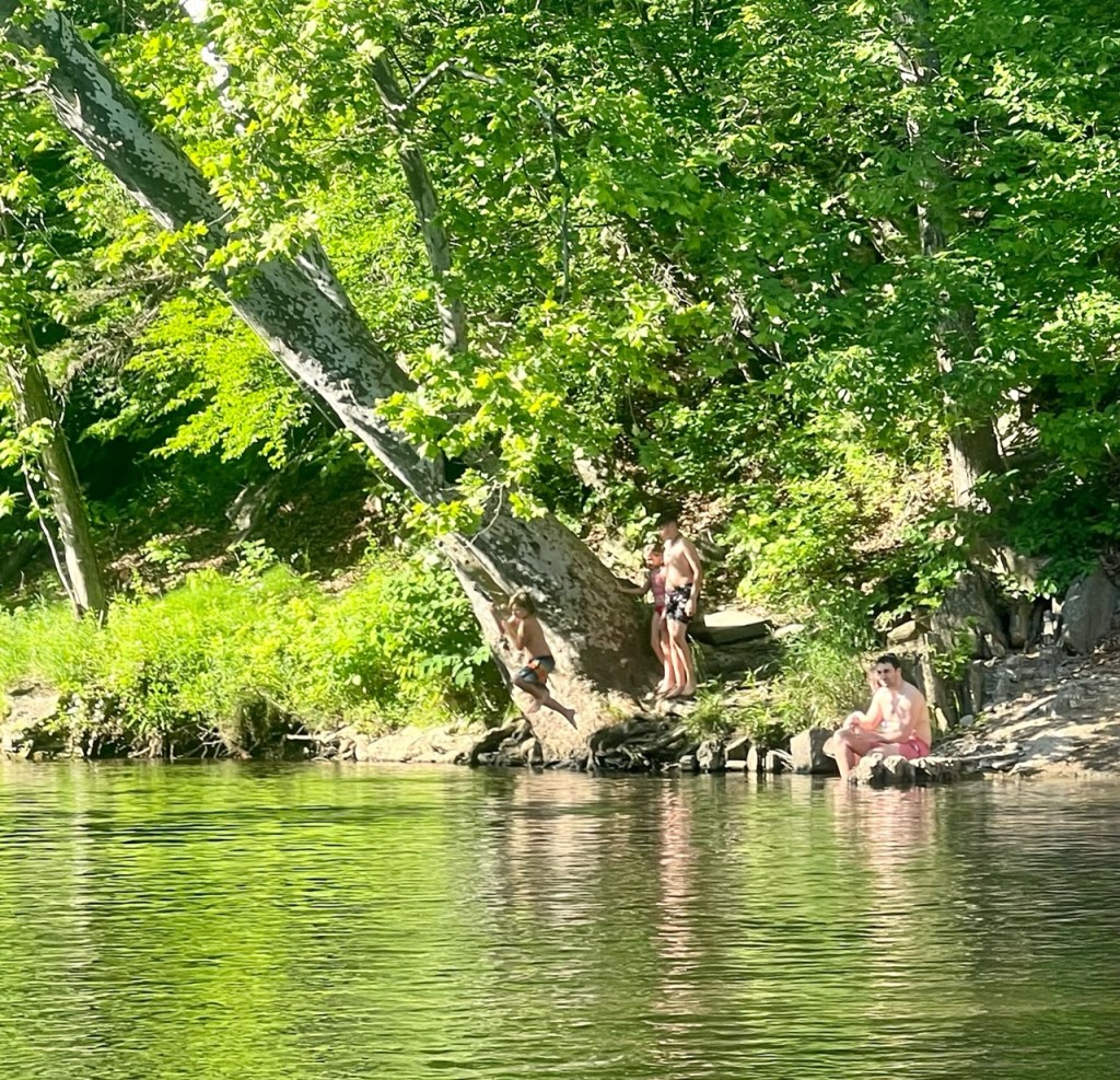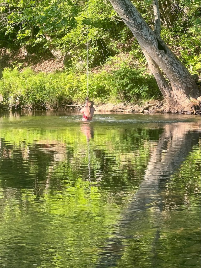 To get to the swimming hole, it was a quick walk from the parking lot. We took some chairs and and set up a little area. It was a lot busier than we expected but it was okay. Blake and the kids swam across the river to the tree with the swim and began swinging into the water. The did this for about an hour. I sat with Taylor while they played, she was exhausted. Some of the kids came back and when they did, I swam to the tree and I jumped off the rope swing one time and I thought I was going to die haha. It was a lot of fun but FREEZING. The water was very cold.