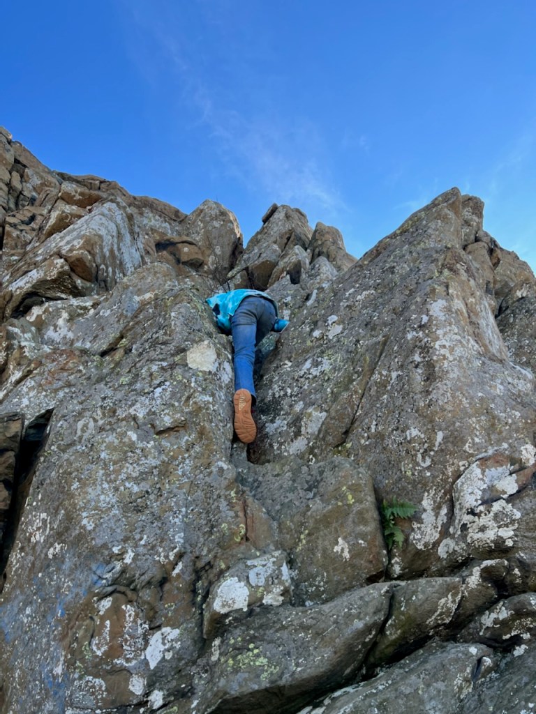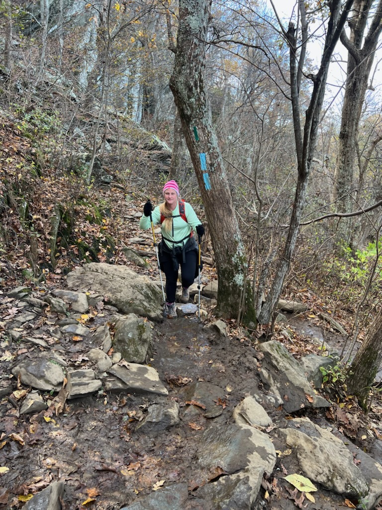About halfway to the summit, there is a side trail that people have made as an “easier” way to the summit, however this is not a sanctioned trail and is not marked with blazes and from the summit it is roped off but people still take it anyways. We continue on the correct trail and continue to follow the blue blazes and make it to the few switchbacks on the trail. Once you get to this point, the rocks are larger and steeper and there is a section of stairs that are spaced out just far enough that the average person would have to take more than one step per stair.