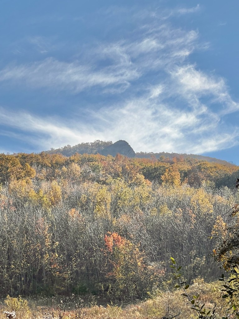 On our way back to the car, still on the Mountain Farm Trail, we could see the outcropping of Humpback Rocks.